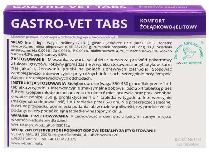 Gołębie dorosłe (waga 350-450 g) profilaktycznie 1 x 1 tabletka w tygodniu. Interwencyjnie (maksymalna dobowa ilość) 2 x 1 tabletkę przez 5-8 dni.